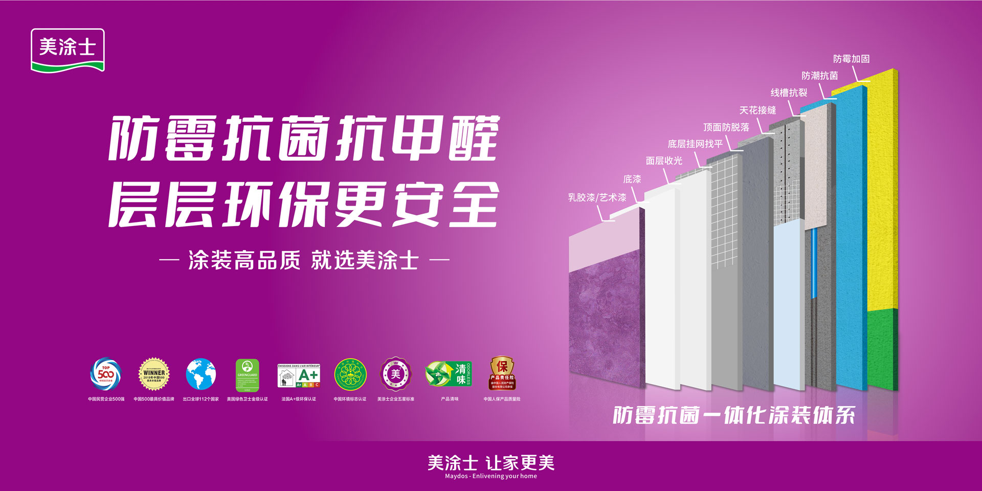 美涂士在多年的經營中堅持“以用戶為中心,與客戶共贏,以價值創造者我本,長期艱苦奮斗,堅持自我批判“的核心價值觀,秉持”人無我有,人有我優“的研發創新理念,一直把客戶的需要作為企業矢志不渝的追求,一直為客戶或廣大消費者提供優質、性價比高、安全、環保、有個性化的產品。 美涂士堅持以技術創新引領行業發展,積累了雄厚的技術實力。